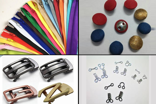 Metal / Polyester Zippers, Alloy Mould Buttons, Alloy Buckles (Metal / Stainless Steel Buckles), Garment Hooks etc
